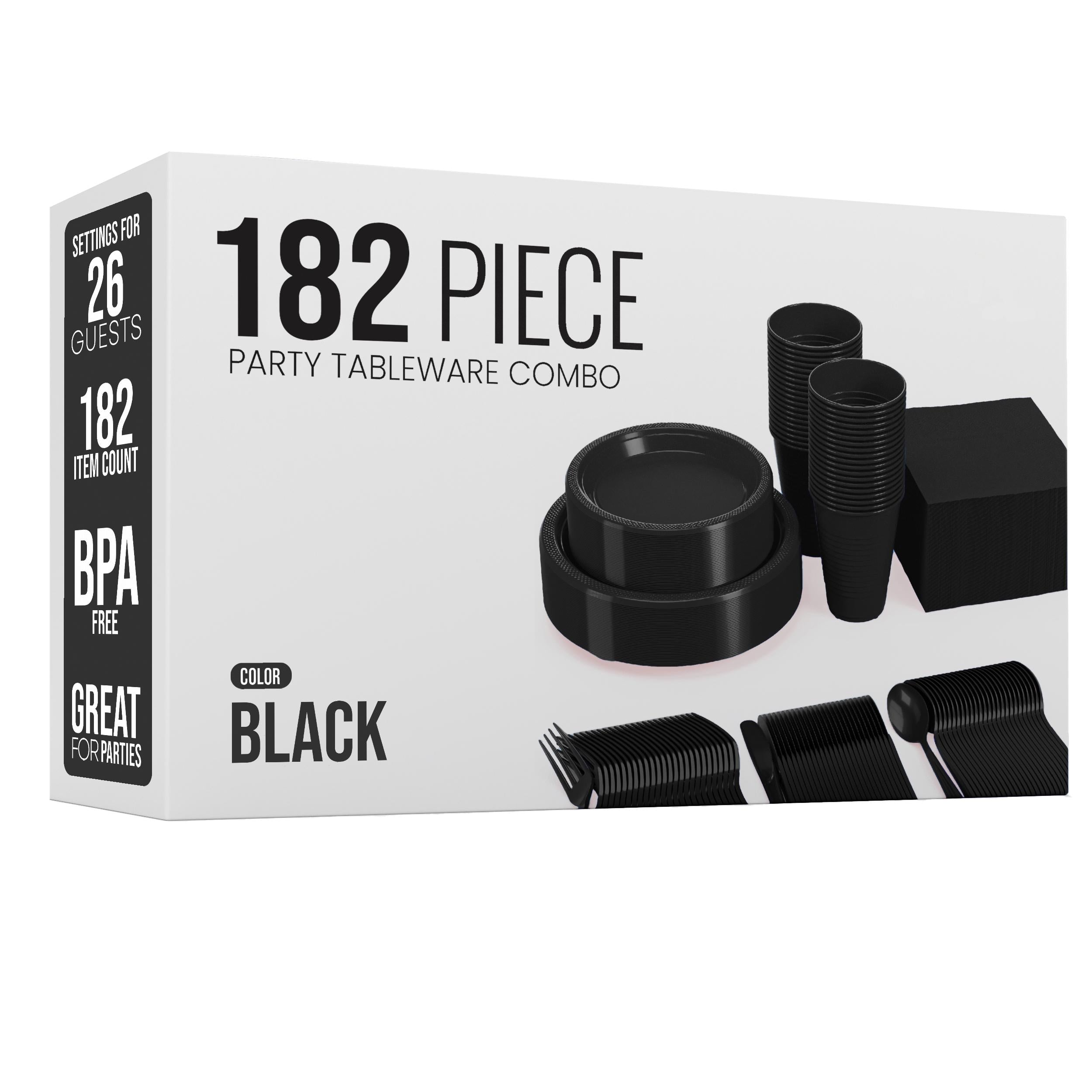 Introducing our 182 Piece Combo Set - Service For 26 - Black, the ultimate solution for all your party needs! These disposable tableware combo sets are perfect for birthday parties, school events, outdoor picnics, holiday gatherings, and large celebrations. They provide an all-in-one solution for serving guests while eliminating the hassle of washing dishes. With a sleek black design, this plastic dinnerware set adds a touch of elegance to any occasion.